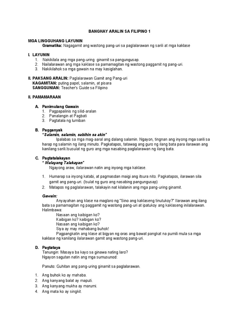 FILIPINO LESSON PLAN SAMPLE MASUSING BANGHAY ARALIN SA FILIPINO 2 I. I Do 1. Paggamit ng mga pang-uring may ibat ibang kayarian.