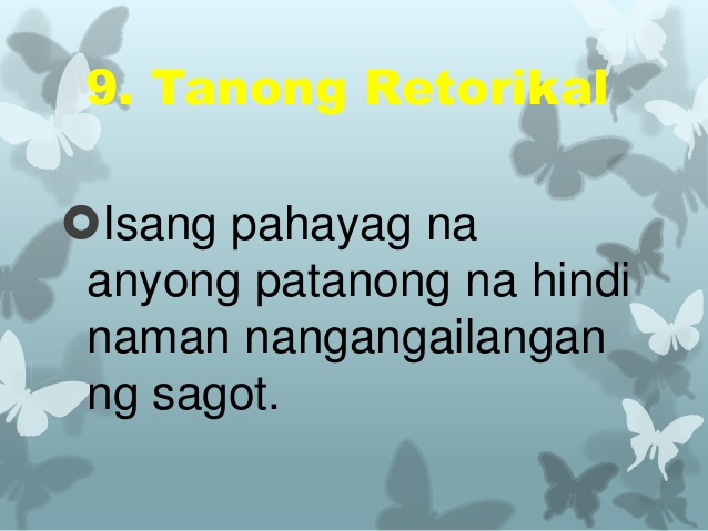 Napakagulo naman ng bahay. Pag-uyamBalintunay Irony - pananalitang nangungutya sa tao o bagay sa pamamagitan ng mga salitang kapag kukunin sa tiyakan ay tila kapuri-puring mga pananalita ngunit sa tunay nakahulugan ay may bahid na pang-uyam HALIMBAWA. Mga halimbawa ng mga retorikal na tanong.